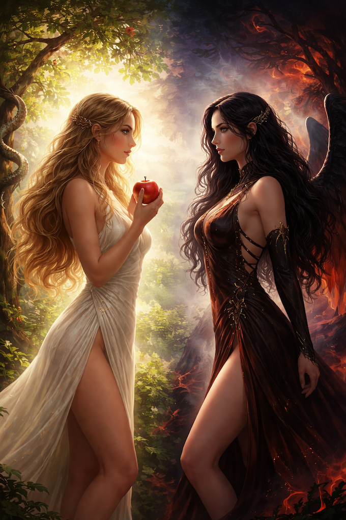 Éva ezzel szemben a kanonikus történet nőalakja. Bordából teremtetik, tehát relációban születik meg. Ő az, aki kapcsolatban gondolkodik, aki a rendszerben marad, aki a közösség és a túlélés logikáját képviseli. A tiltott gyümölcs elfogyasztása nála nem lázadás, hanem kíváncsiság és kapcsolati dinamika eredménye.