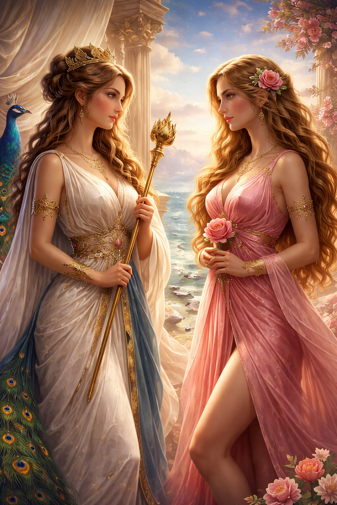 Héra a házasság, az intézmény, a társadalmi rend istennője. Királynői minősége nem pusztán státusz, hanem struktúra. Ő a legitimáció, a törvényes kötelék, a formába rendezett kapcsolat képviselője. Jelenléte stabilizál.