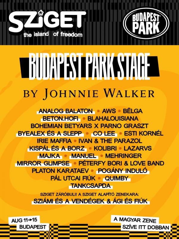 A Budapest Park Stage by Johnnie Walker fellépőinek névsora egyfajta Sziget-történeti időutazás is egyben, hisz érkeznek olyan zenekarok is, akik már az első „Diákszigeten” is ott voltak, ilyen például a Kispál és a Borz vagy a Tankcsapda. Utóbbi az akkori időszak meghatározó punk-rock albumával, A legjobb méreg dalaival jön most újra. Aztán sorjáznak majd a további nagy kedvencek, mint a Pál Utcai Fiúk, a Quimby, a Bëlga, a Péterfy Bori & Love Band, az Irie Maffia, az Esti Kornél, a Bohemian Betyars és a Parno Graszt közös műsora, Majka, a Blahalouisiana, az Ivan & the Parazol, Byealex és a Slepp, Kolibri, a Platon Karataev, a Lazarvs, az AWS, az Analog Balaton, a Mirror Glimpse, Beton.Hofi, Pogány Induló, Co Lee, Mehringer, illetve Manuel. Az új színpad és egyben a Sziget idei záró koncertjét pedig a társalapító, Müller Péter Sziámi és zenésztársai adják majd. Ráadásul az immár hagyománynak számító záró aktusnak idén külön aktualitást ad a legendás szövegíró és énekes 75. születésnapja.