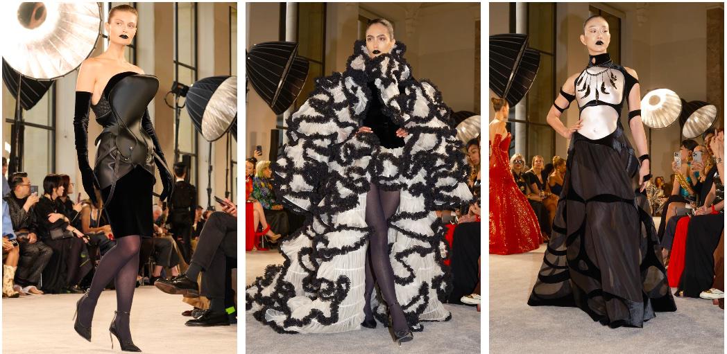 Aztán jönnek a fantázia-darabok: Elsa ikonikus „Apollo” köpenye, amelyet most háromrétegű, fémből készült csillagrobbanások formájában, különböző árnyalatú feketére, pisztolyszürkére és szaténézű ezüstre galvanizált, óriási diamanté-ékszerörvényként képzeltünk újra; egy tüll „Kacskaringók és kígyóvonalak” ruha, kagyló alakú 3D hímzésekkel, fehér selyemorgandin pufiréteggel, fekete organdi napernyővel; matador ihlette dzsekik és kabátok, barokk gyöngyökkel, fémes leopárdmintákkal, fekete jet gyöngyökkel kirakva – mind a ház védjegyei.