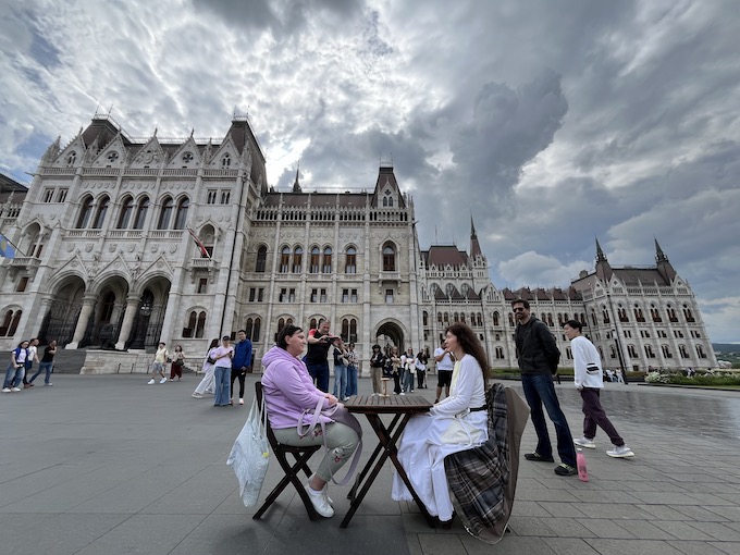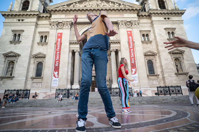 Turistacsoportok, szelfiző külföldiek és a rollerrel a bulinegyedbe szlalomozó fiatalok között előbb nyolc-tíz – később inkább tizenöt – felszabadult ember táncolt. Teljes csöndben. Hallható zene nélkül. Egymástól független ritmusra. Mindenki a saját playlistjére mozgott, mégis közösség született. Japán, kínai, angol, spanyol és magyar résztvevők együtt mozdultak a szabad tánc univerzális nyelvén. A performansz a Szent István-bazilika előtt teremtett hidat a szent és a profán, az egyéni szabadság és a közösségi bátorság között.